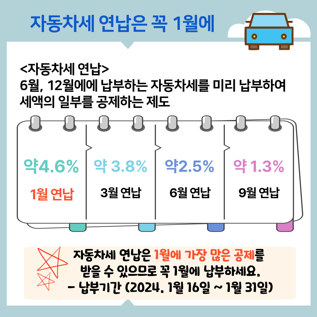 2024년 자동차세 1월 연납이 10%에서 5%로 할인율이 변경되었으니 아직 자동차세 연납 신청하지 않으셨다면