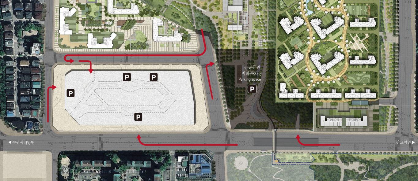 - (도보 11분 소요) 경기 수원 의료원, 파크푸르지오, 두견마을 : 61, 98 / 직행버스 1009