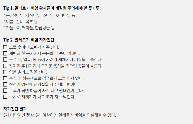 알레르기 비염을 알아보는 자가진단 <출처 : 국민건강보험>